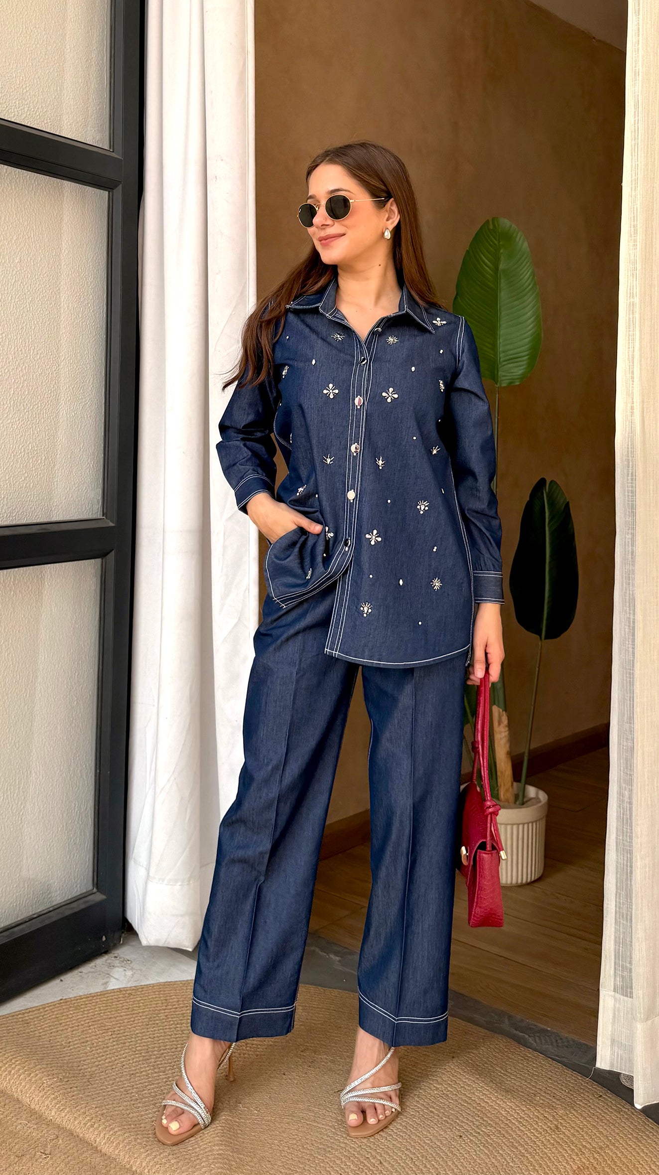 2 Piece Denim Co-Ord Set (Pant + Shirt) with Silver Rhinestones